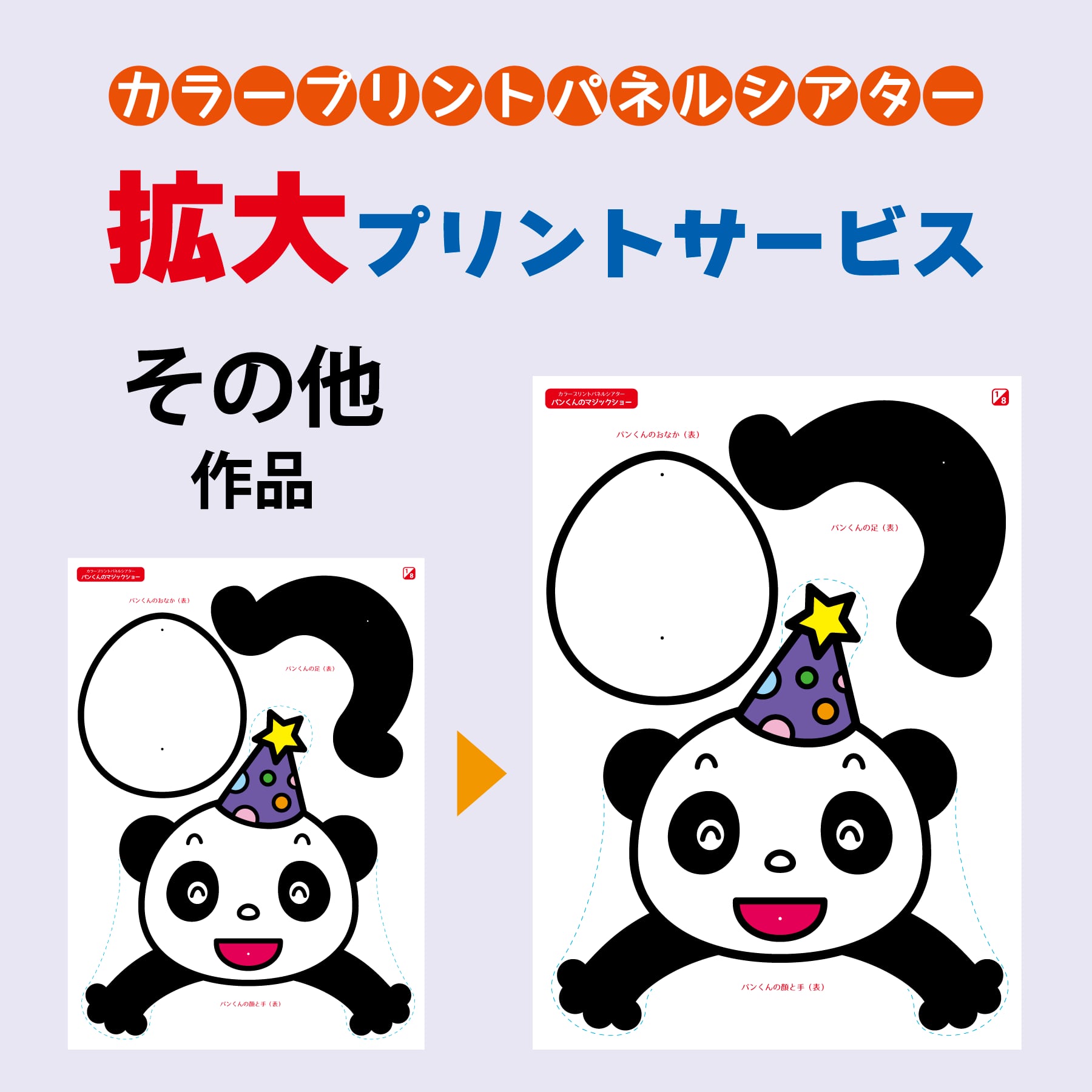 カラープリントパネルシアターの絵人形が、大勢の前で演じるには少し小さい、とのことで拡大プリントのご要望が多数寄せられました。それを受けましてこのたび正式に絵人形本体を拡大プリントするサービスを開始しました。