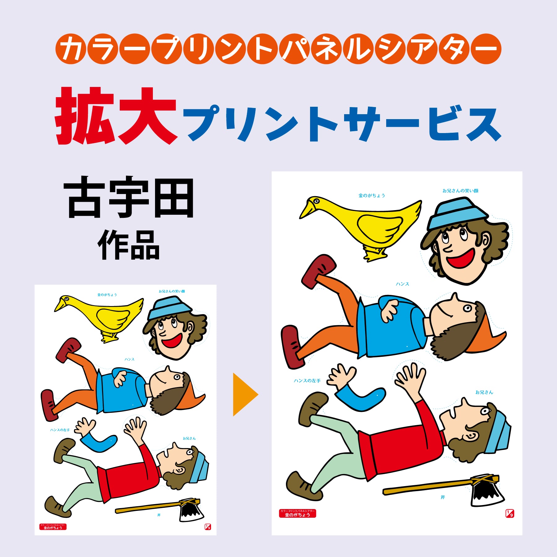 カラープリントパネルシアターの絵人形が、大勢の前で演じるには少し小さい、とのことで拡大プリントのご要望が多数寄せられました。それを受けましてこのたび正式に絵人形本体を拡大プリントするサービスを開始しました。