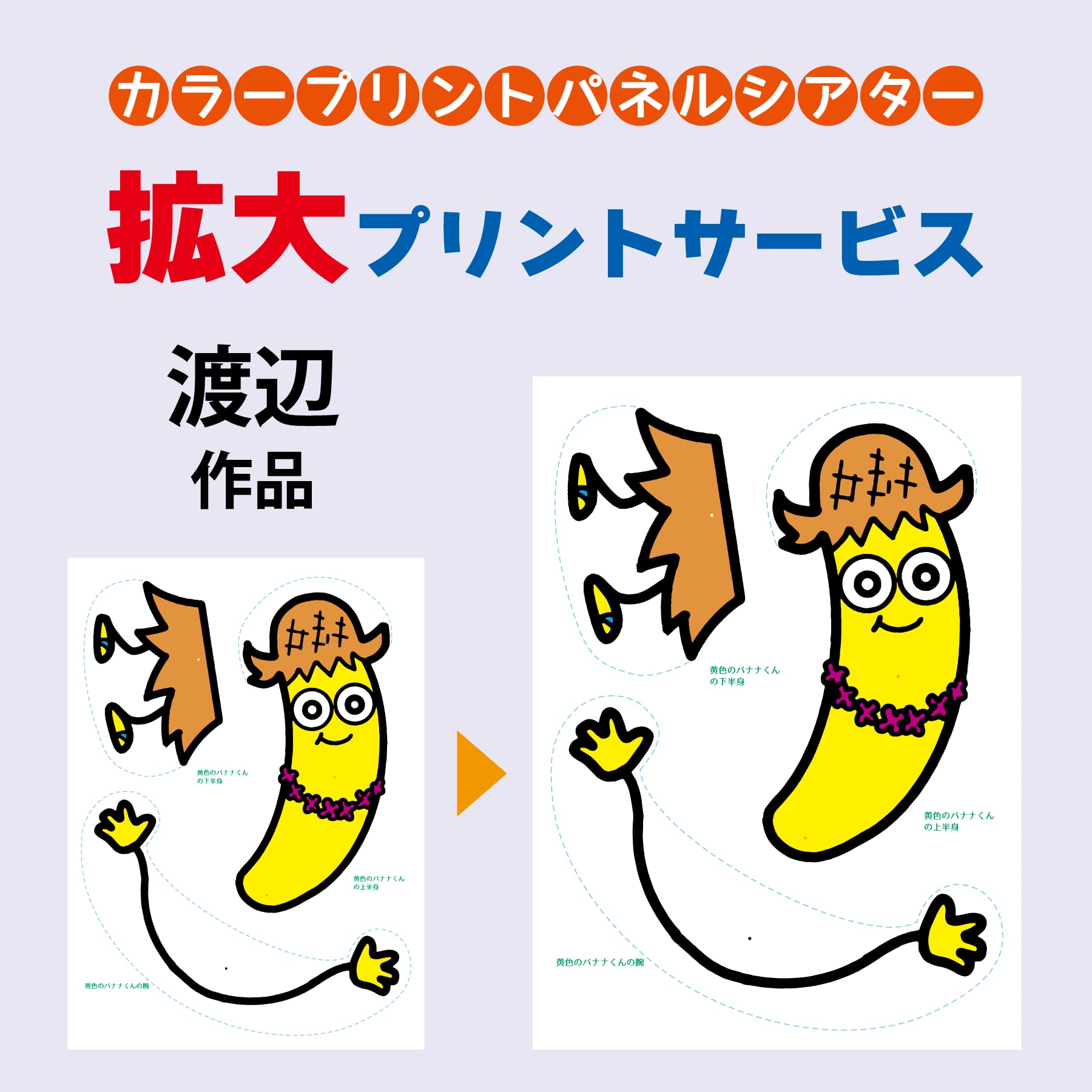 カラープリントパネルシアターの絵人形が、大勢の前で演じるには少し小さい、とのことで拡大プリントのご要望が多数寄せられました。それを受けましてこのたび正式に絵人形本体を拡大プリントするサービスを開始しました。